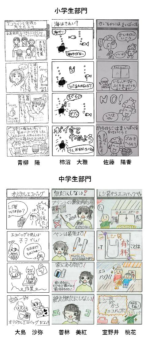 この夏、環境課では節電や節水、リサイクルといった「エコライフ活動」をテーマに、4コマまんがを募集しました。市内在住の小中学生から計340点の応募があり、選考の結果、以下の作品が最優秀賞、優秀賞として選定されました!