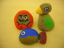川原に行って、石を拾うことから始めましょう。作りたい物を思い浮かべて石を探してもよし、出会ったいろいろな形の石を見て作品のイメージを膨らませてもよし!
