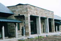 文化活動交流館は、すでに解体された石蔵の石材を再利用し、敷地内に現存する石蔵との調和を図っています。特に「つるめの跡※」をデザイン的に利用することでおもしろい雰囲気の建物になっています。また、地場産材の杉板をなるべく多く使い木質化を図っています。