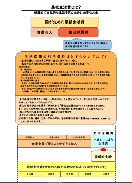 病気などのやむを得ない理由で収入を得ることができなくなった方(世帯)で、親族からの援助も受けることができず、活用できる資産も全く無く、他の施策を活用しても最低限度の生活を維持することができない方に対して、国が最低限の生活を保障するとともに、自分の力で生活をしていけるように手助けをする制度です。
