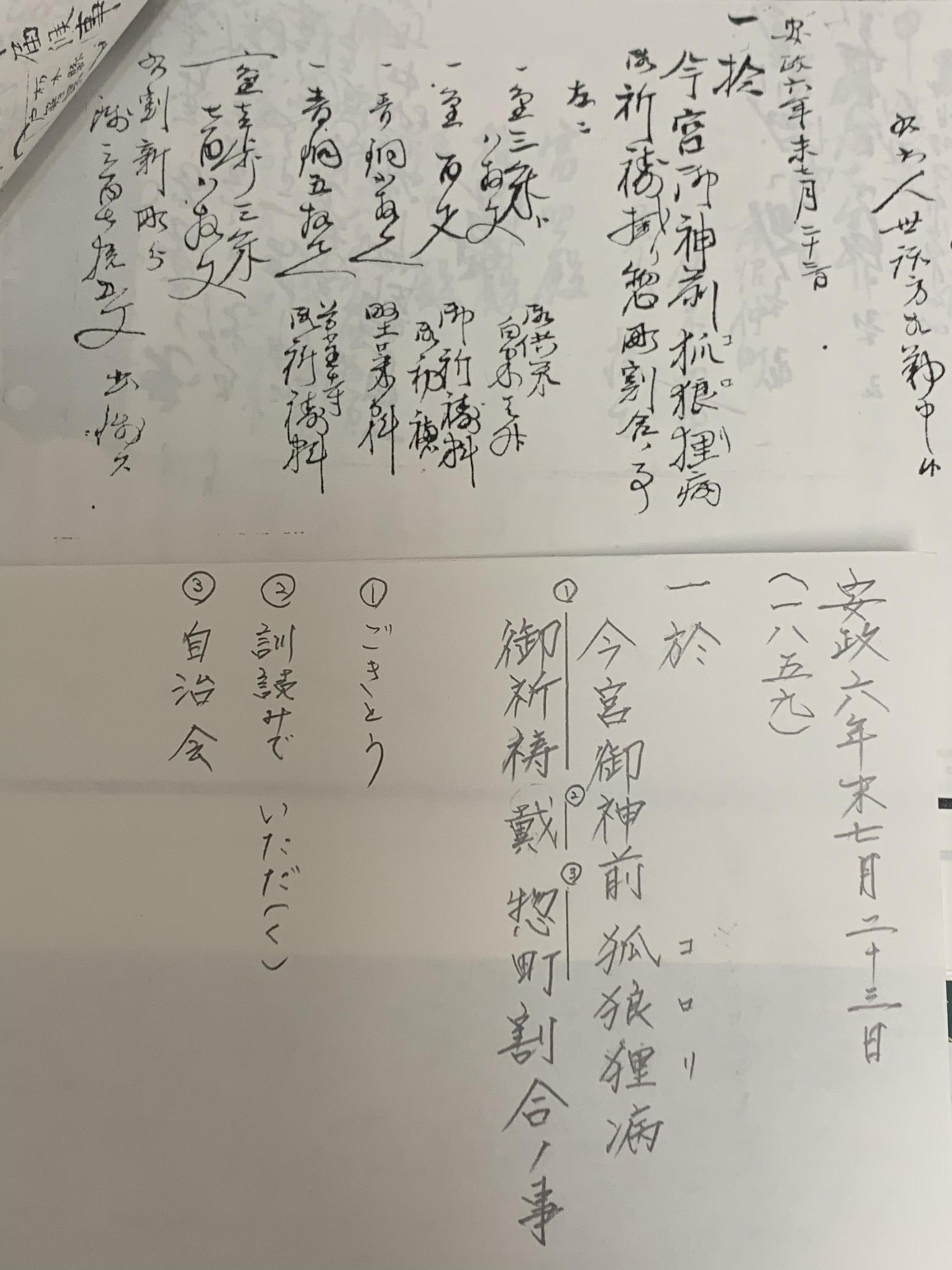 安政5年(1858)年に江戸で大流行しましたが、麻苧町古文書は安政6年(1859)の7月23日の日付で文章が記されています。
